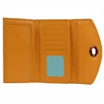 Billetera de dama en cuero vacuno, cerrado con accesorio metálico, contiene 2 compartimientos, 5 bolsillos para guardar tarjetas de visita o de crédito, 1 compartimientos para DNI. Medidas abiertas: