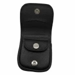 Monedero elaborado en cuero vacuno, con doble broche y para colocarse en cinturón. Tamaño cerrado: 7x6 cm.