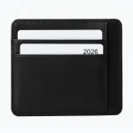 Estuche para tarjetas en cuero símil, con compartimientos para tarjetas de visita o de crédito, 2 de forma horizontal y 1 en vertical. Tamaño abierto: 11.5x8cm.